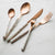 No pierdas la oportunidad de añadir un toque de elegancia y sofisticación a tu mesa con este conjunto de cubiertos de acero inoxidable en color cobre y detalles de mármol. Haz clic aquí para comprarlos ahora y elevar el nivel de tus comidas con un toque de distinción. ¡No esperes más y adquiere estos exquisitos cubiertos de mesa hoy mismo!, 5 piezas: tenedor , cuchara, cuchillo, cuchara postre y tenedor postre.